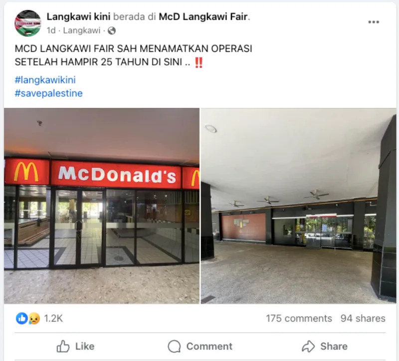 While not confirmed, it was believed that a McD outlet in Shah Alam closed down due to the boycott and it looks like another one has followed suit. A couple of days ago, two photos were posted on the Langkawi Kini Facebook page that showed a closed-down McDonald’s outlet located in Langkawi Fair Shopping Mall.