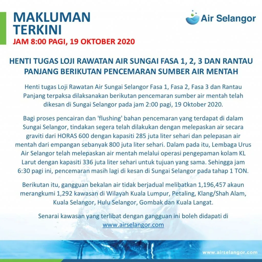 According to Air Selangor, the water treatment plants at Sungai Selangor Phase 1, Phase 2, Phase 3 and Rantau Panjang had to be shut down after a contamination rate of 1 TON was detected in the raw water source from Sungai Selangor. This issue was reported to be discovered at 2am this morning (19th October).