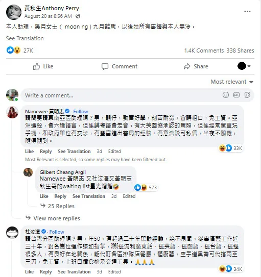 On 20th August, Anthony announced the news on his Facebook. “My assistant Ms. Moon Ng has resigned in September. From now on, her affairs have nothing to do with me,” he stated. The post immediately drew attention from both Chapman To and Namewee. The duo were quick to offer their services and even listed out a summary of their resume.