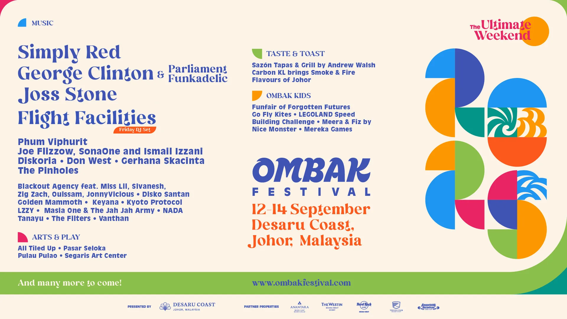 Presented by Desaru Coast — the award-winning destination resort and home to five-star resorts all within walking distance of the festival village, grounds, and stages — Ombak Festival celebrates vibrant outdoor living with a distinctly Malaysian flair, natural charm, and a warm, inclusive vibe that resonates with every kind of festival-goer.