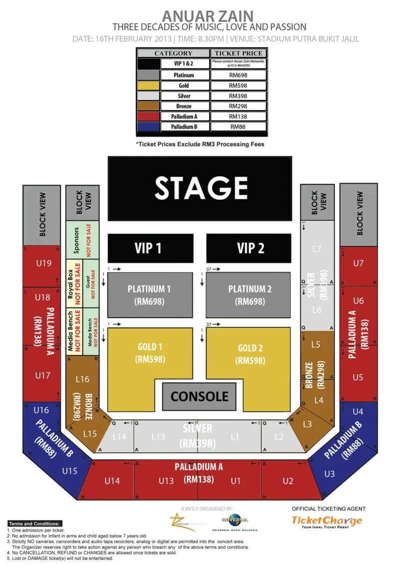Anuar Zain Three Decades of Music, Love and Passion Concert tickets are priced between RM88 and RM698, will go on sale starting 12pm, on 12th December 2012 via Ticketcharge and its authorized outlets. There will be a special early bird discount for the first 1,000 tickets sold, between 12th till 19th December. Seating plan is as follows: