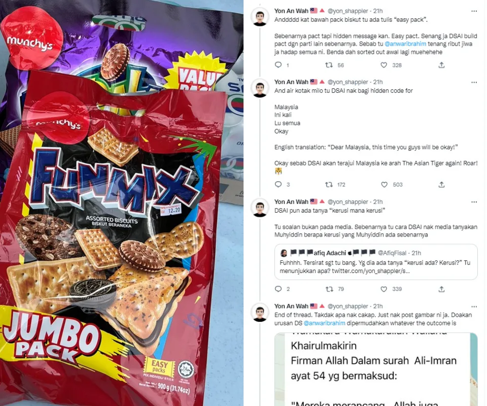 He added, “The price for the pack of biscuits is RM12.20, which means that DSAI has already gained the majority of the seats on 20th November. The biscuit is the (Munchy’s) Funmix brand. The biscuit is also a FUNMIX brand which may be an indication that there will be a mix of people from different races and religions in the DSAI administration as PM10 later. DSAI has always been known for his fight for a multiracial (political) party.”