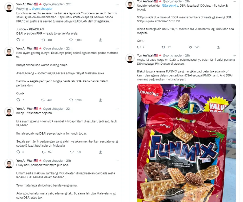 The Twitter user then explained, “‘Lunch is served’ might be referring to the term “justice is served”. This term is always used in court. But for the context of what happened after GE15, it means that JUSTICE (‘Keadilan’, PKR) has been served. The president of PKR, DS Anwar is ready to serve Malaysia!”