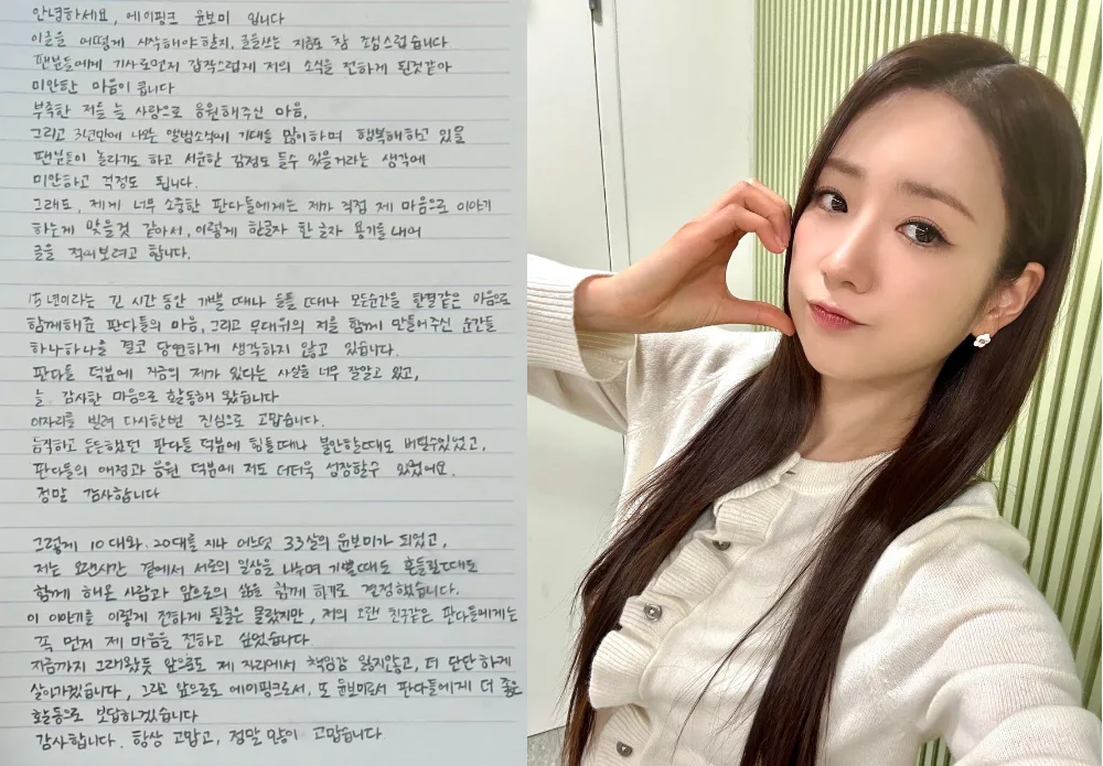 The idol also mentioned that she will continue her activities as a singer and a member of Apink, promising to repay all the love and support she received from fans in the past 15 years. Earlier this week, the group announced their 11th mini-album, “RE:LOVE”, which will be released in January 2026 in commemoration of their 15th anniversary. The title track “Love Me More” is composed by Rado, who has worked with Apink since 2011.