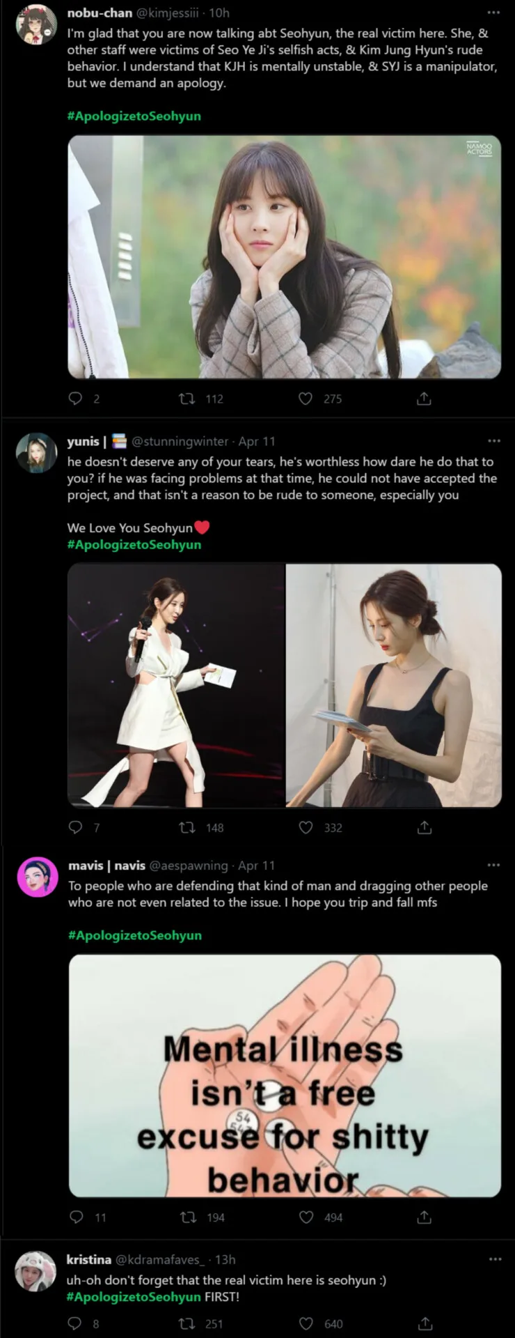 Some fans also defended the actress from Jung Hyun’s supporters for using his mental health as an excuse for his inappropriate behaviour. This further proves how often most fans are willing to put their morals before their Korean celebrities.