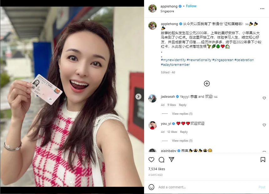 The 43-year-old actress announced the news via her socials with a photo of her and her new ID card. “From today onwards, I have a new ID card and (a new) nationality!” she cheered. Apple shared that she had first arrived in Singapore in 2000 for work. However, her life grew to contain so much more than that.