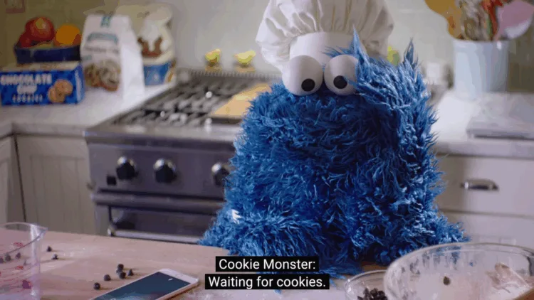 And in true Cookie Monster nature, he then proceeds to kill time by switching the oven lights off and on, eating some flour, reading, pacing around the kitchen, gobbling up a wooden spoon, and basically doing everything that he can to contain his impatience. In the end, Siri reveals less than a minute has passed.