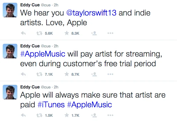 In regards to Taylor’s open letter, it appears to have reached Apple Music loud and clear as Apple’s Eddy Cue has reached out to her via Twitter. Taylor’s threat to withhold her album from the company may just have prompted a policy change at Apple as Eddy Cue has announced that Apple Music will change its plan and pay royalties to artistes even during its three-month free trail for users.