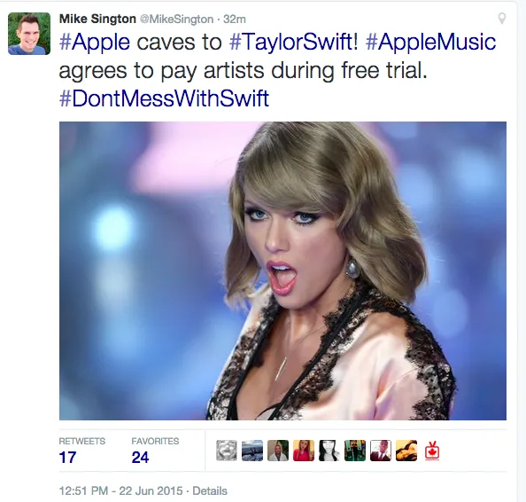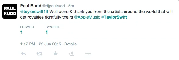 Good job #AppleMusic. I’m glad, thx to @taylorswift13, that artists/writers etc will be paid during the trial period. It’s the right thing.