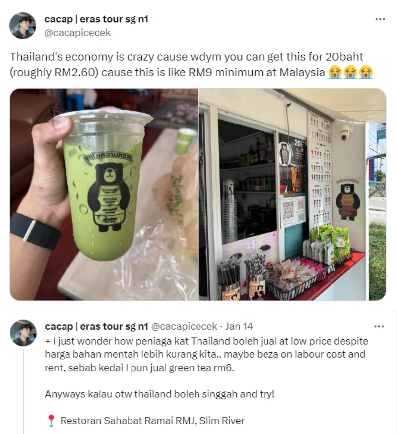 Recently, many netizens were discussing the cost of an average drink from a cafe in Thailand versus in Malaysia after a local shared that he paid RM3 for an iced milk tea while vacationing in Thailand.