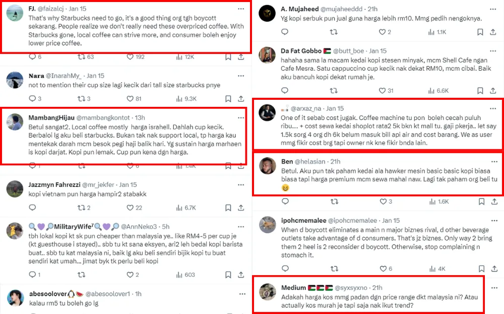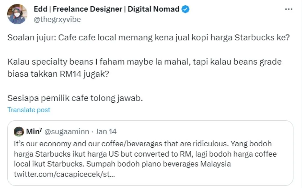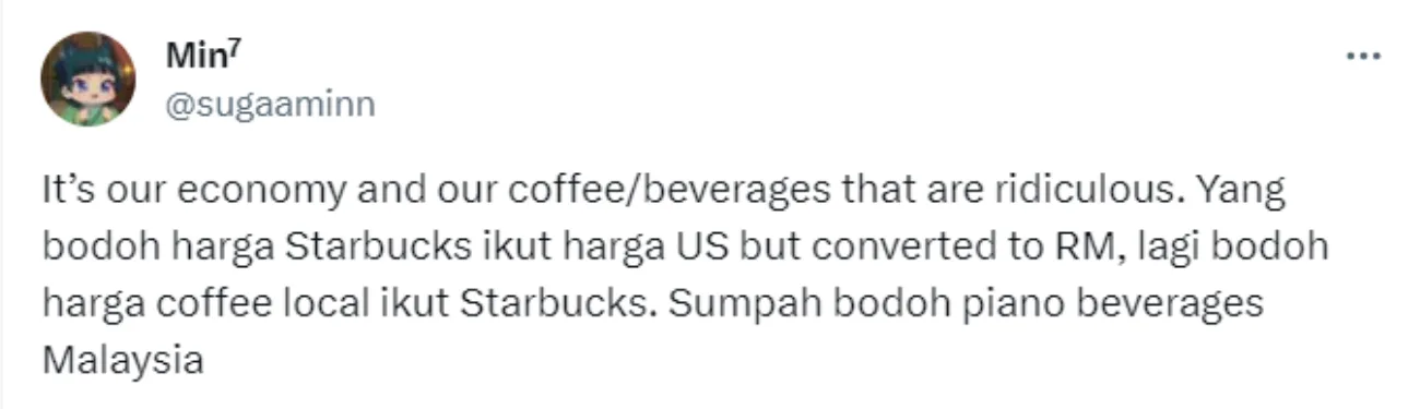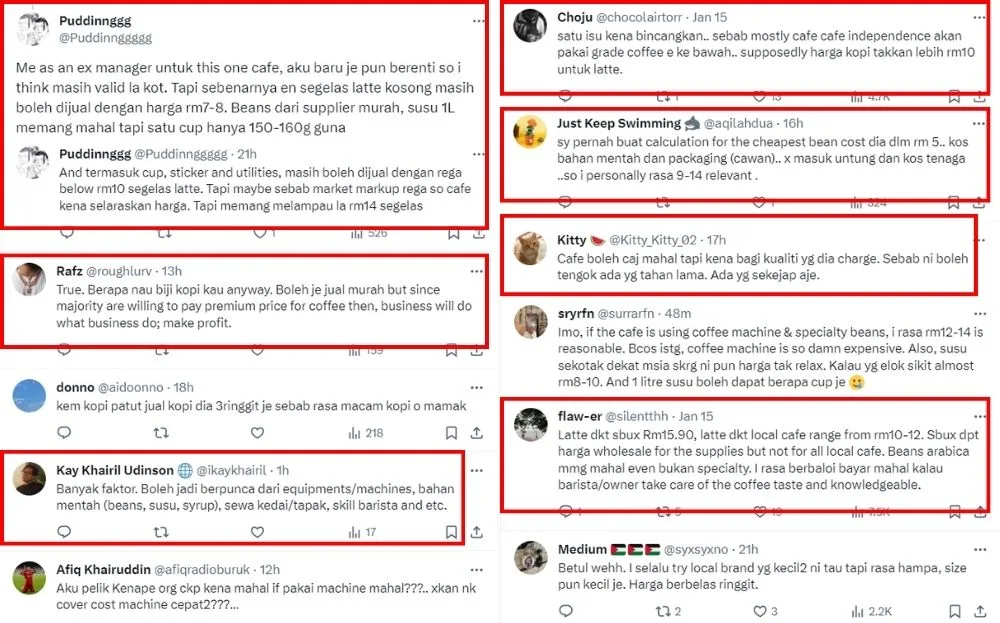 The user laments that local cafes are simply following the Starbucks pricing rather than using calculations based on cost, which is why an average coffee drink would cost around RM10 to RM15. Many netizens began sharing their opinions on the tweet, with some agreeing that some cafes are overpriced.