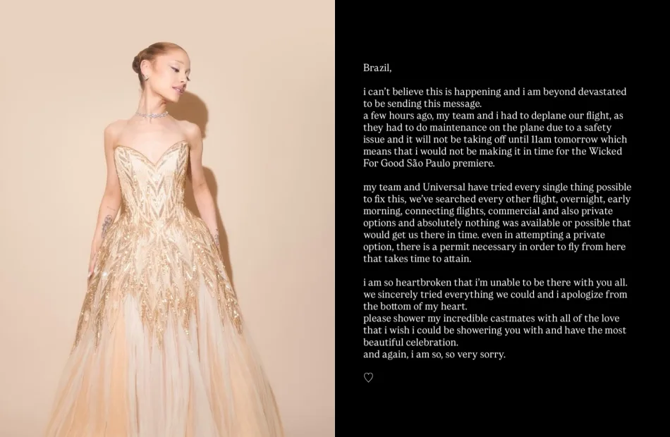 Superstar and Oscar nominee Ariana Grande is currently on a press tour, attending premiere events alongside her castmates for the upcoming film “Wicked: For Good”. Unfortunately, she was unable to attend the premiere screening in Brazil due to flight issues. While she apologised for her absence, not everyone took the news well.