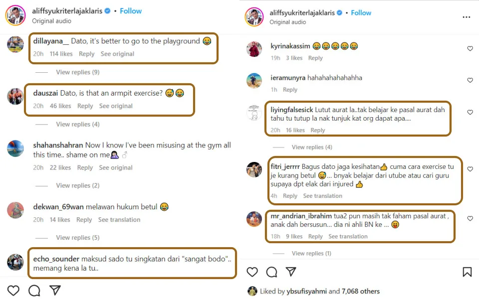 Many netizens have taken to the comments section to poke fun at Aliff’s workout video. “Dato’, I think it’s better for you to go to the playground (rather than the gym),” one netizen said. Another commenter added, “Is that an armpit exercise?” while one left a humorous comment saying, “I just realised that I’ve been misusing gym equipment all this time. Shame on me.”