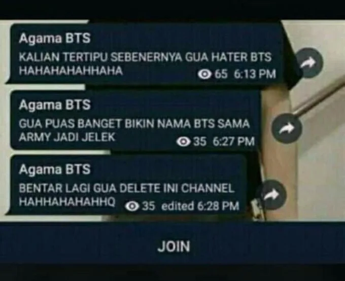 Mohon report ye semue grup telegram ni .. aku tak rase orang yg wujudkan grup ni betol2 sembah bts , die cuma nk menghina agama Islam so die menggunakan army2 ni, mane army yg bodoh tu pon ikot https://t.co/yNparaFqqx