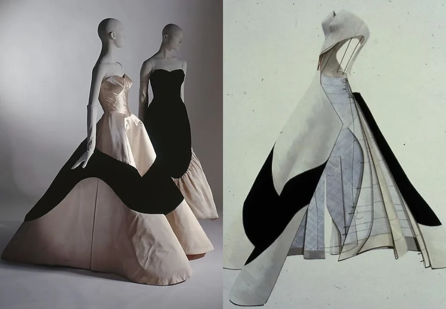 And finally, Charles James, who treated garments like engineering problems. His dresses were constructed with architectural precision. They held their own shape, sometimes literally, existing as sculptures even without the body inside them. Where Kawakubo distorts and Fortuny liberates, James builds, turning the body into a structural consideration, something to design around and against.