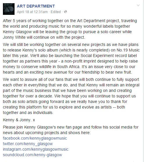 From the announcement of their separation on Facebook, Jonny White mentioned that he will include Glasgow’s solo album release on his label No. 19 Music. Although, they’re not working together anymore, the duo will still remain friends as they’re parting on good terms.
