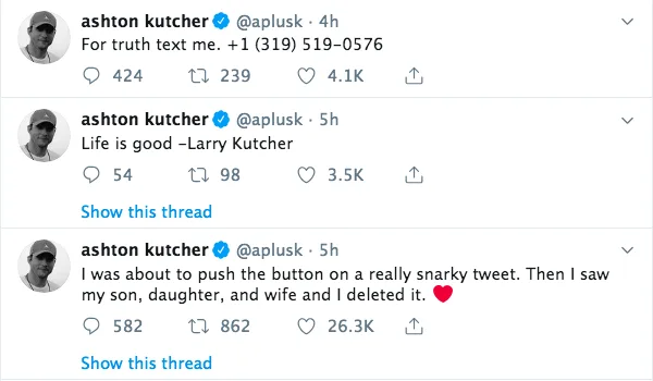 “I was about to push the button on a really snarky tweet. Then I saw my son, daughter, and wife and I deleted it,” the 41-year-old actor tweeted, before adding in a separate tweet, “For truth text me. +1 (319) 519-0576“.