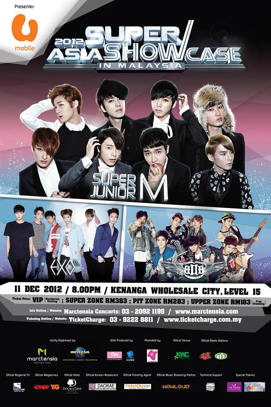 Fans of Super Junior-M, EXO-M, and BTOB, get ready to grab your tickets! Slated to rock Kuala Lumpur on 11th December 2012 (Tuesday), the “2012 Asia Super Showcase in Malaysia” is jointly organized by Marctensia Concerts and Universal Music Malaysia. Other partners include Artist Produced by S.M. Entertainment and Cube Entertainment.