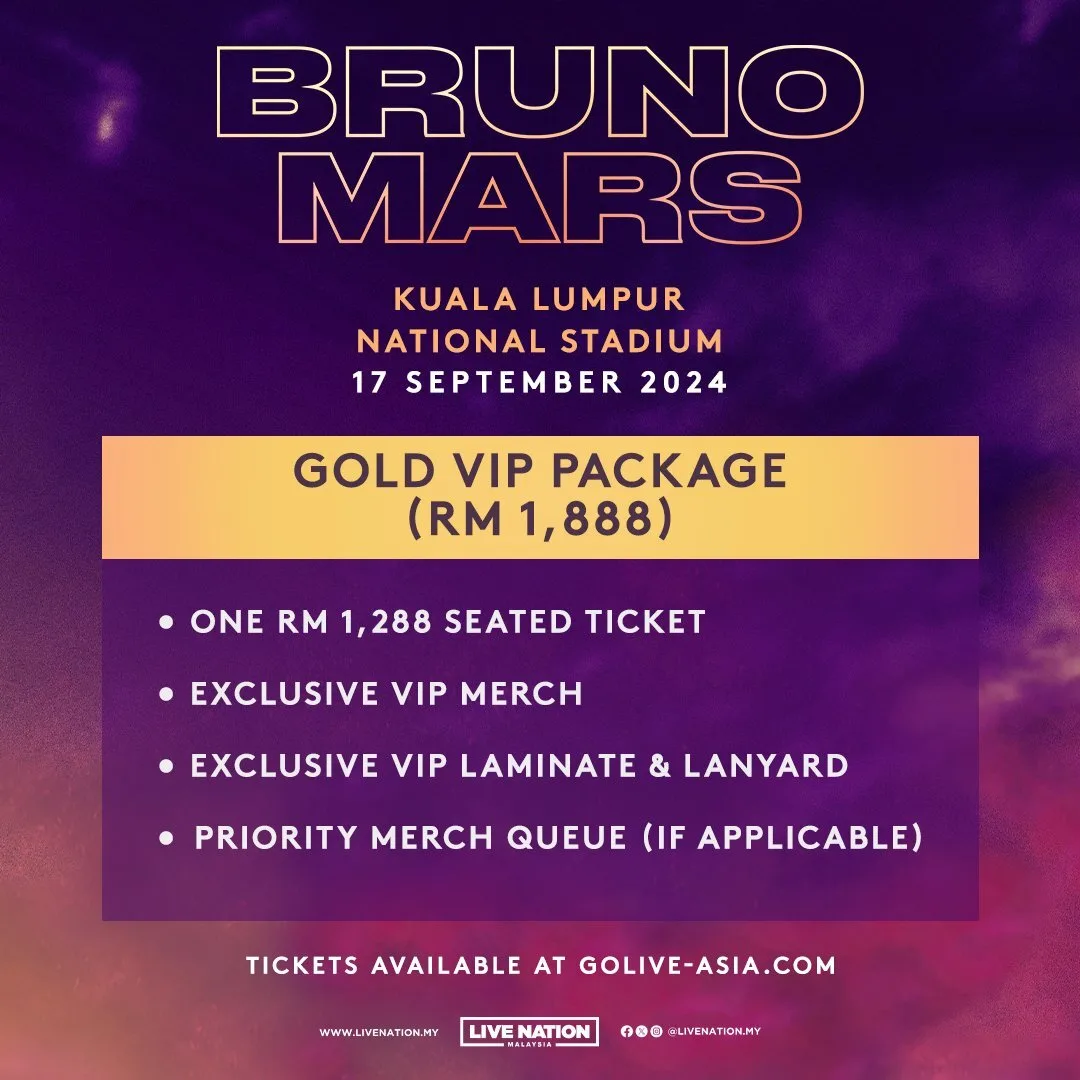- Gold VIP Package: One RM1,288 seated ticket, exclusive VIP merch, exclusive VIP laminate pass and lanyard, and priority for merchandise queue (if applicable)