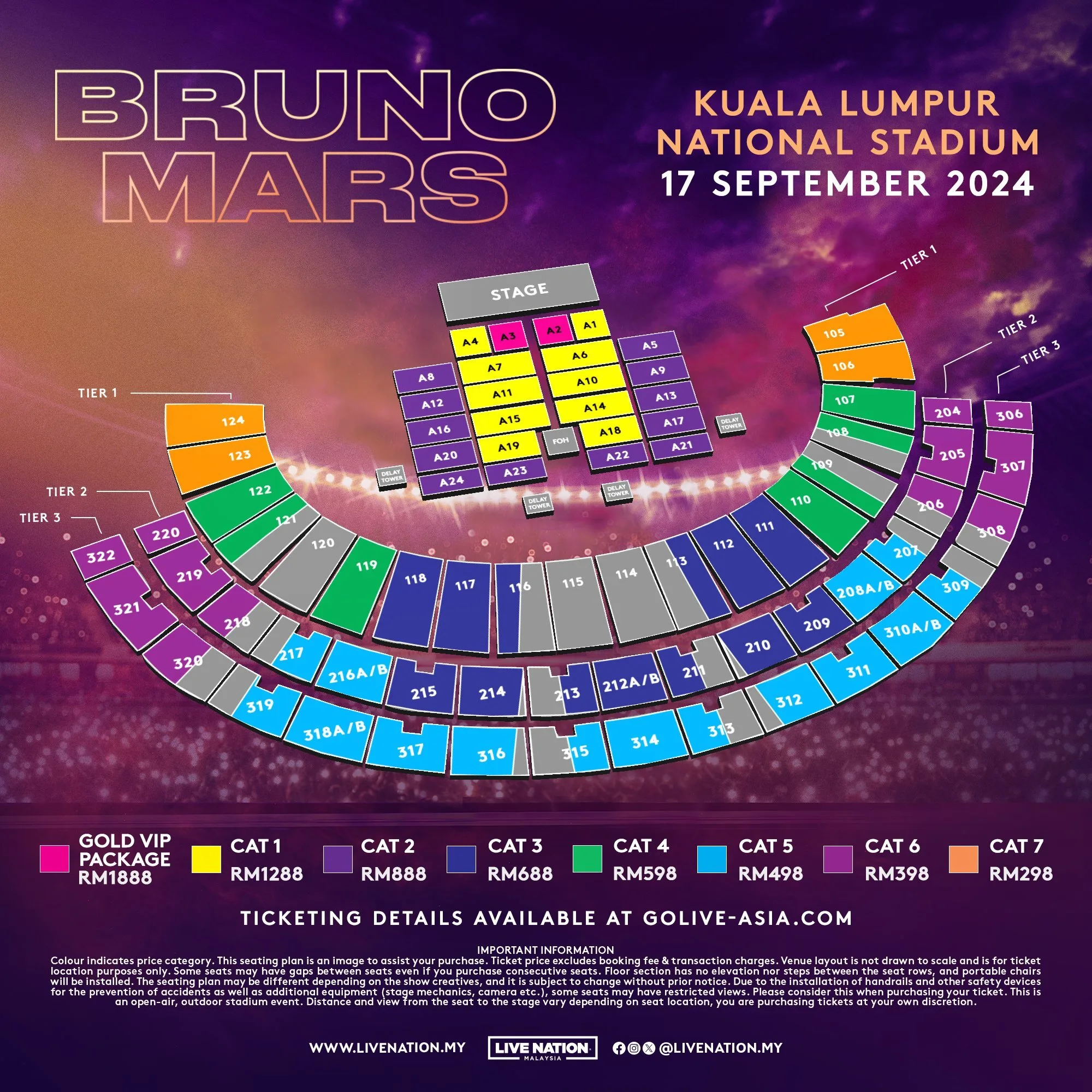 After Bruno Mars announced his one-night-only concert on 17th September at the National Stadium Bukit Jalil, fans have been (im)patiently waiting for Live Nation Malaysia to drop the ticketing details – and here they are! With just a day to spare for pre-sale (and two days to spare for general sales), here are the ticket prices and seating map for the highly anticipated concert: