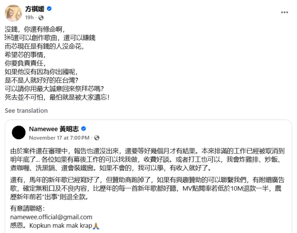 On 19th November 2025 (Wednesday), Taiwanese influencer Sprite Fang (方祺媛) called out Namewee through her Facebook page, mocking his job-seeking post. Earlier in the week, the singer shared on social media that all his scheduled work had been cancelled because of the recent case. As such, Namewee is searching for job opportunities, saying he’s willing to do odd tasks to make ends meet.