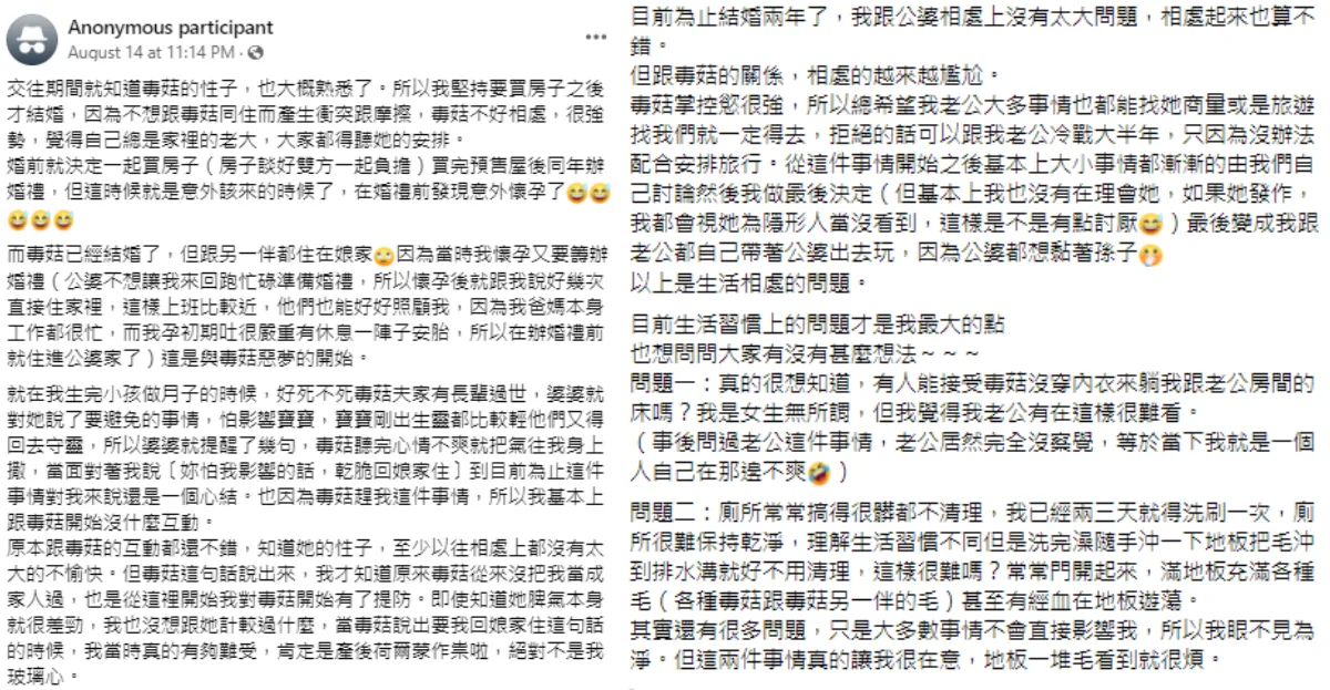 The lady recently took to Facebook group 毒姑九賤婆媳討論區 to air her grievances and share her story. According to her, she had wanted to avoid conflict among her in-laws and had hoped to buy a house prior to marrying her husband, however, she had gotten pregnant before they managed to get the house. As such, she ended up living with her parents-in-law.