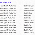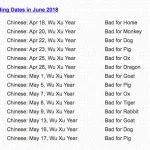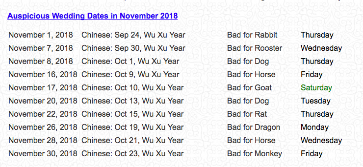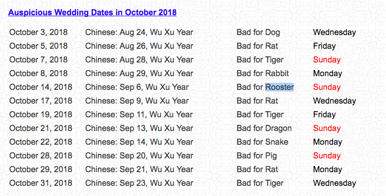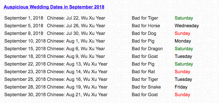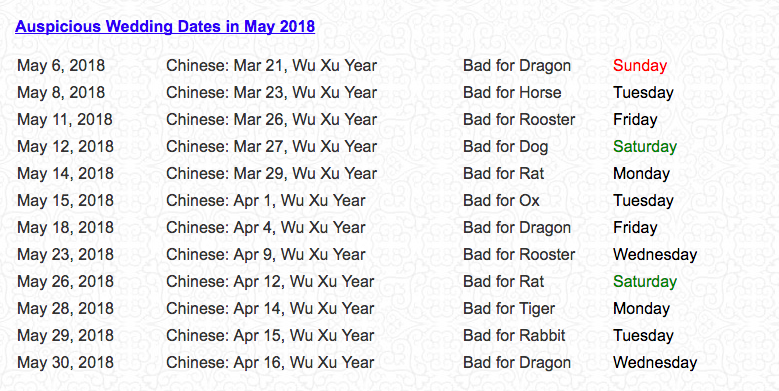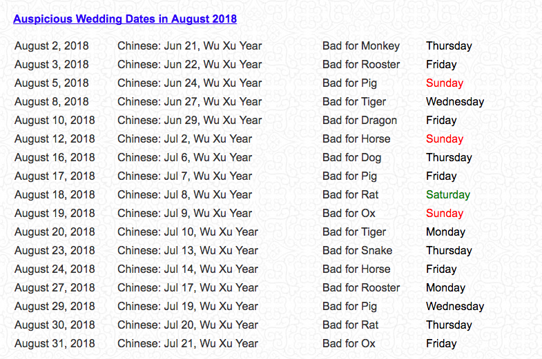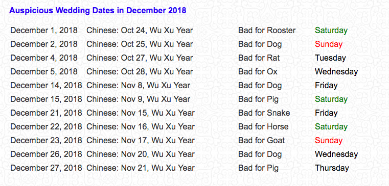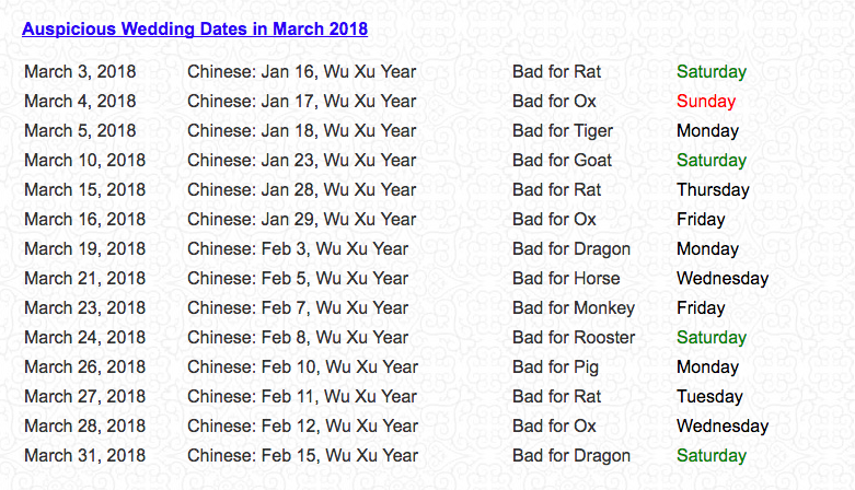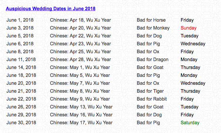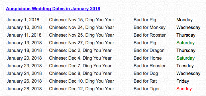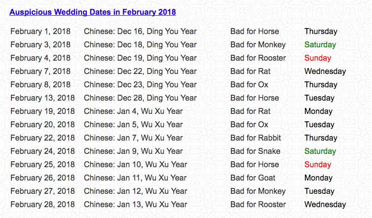 Of course, that’s not all. We’ve provided a chart with all the suitable days for marriage in 2018 (which is also the year of the dog). There are 2 versions – English and Chinese – that vary slightly in terms of wedding dates.