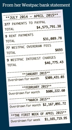 In 2012, Lee opened an account with Westpac bank and received regular deposits from her parents. Her first overdraft was on 22nd July 2014, when a monthly rent payment of A$3454 (RM10,000) put her account into debit.