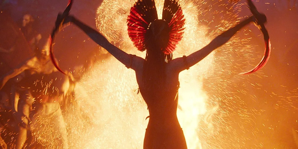 Varang, meanwhile, remains an intriguing yet underdeveloped presence. Oona Chaplin commands attention in every scene, from the striking red headdress to unsettling rituals involving severed kuru, along with her bug-eyed eyeshadow stares. We see her hypnotise, dominate, and devastate the jungles, proving her prowess. A hallucinatory sequence involving Quaritch hints at her mastery of psychological manipulation.