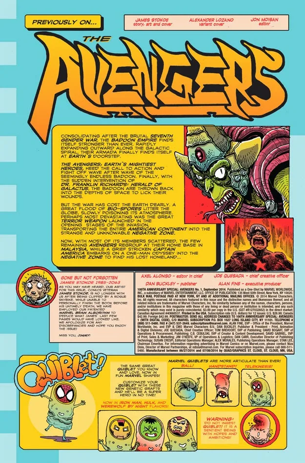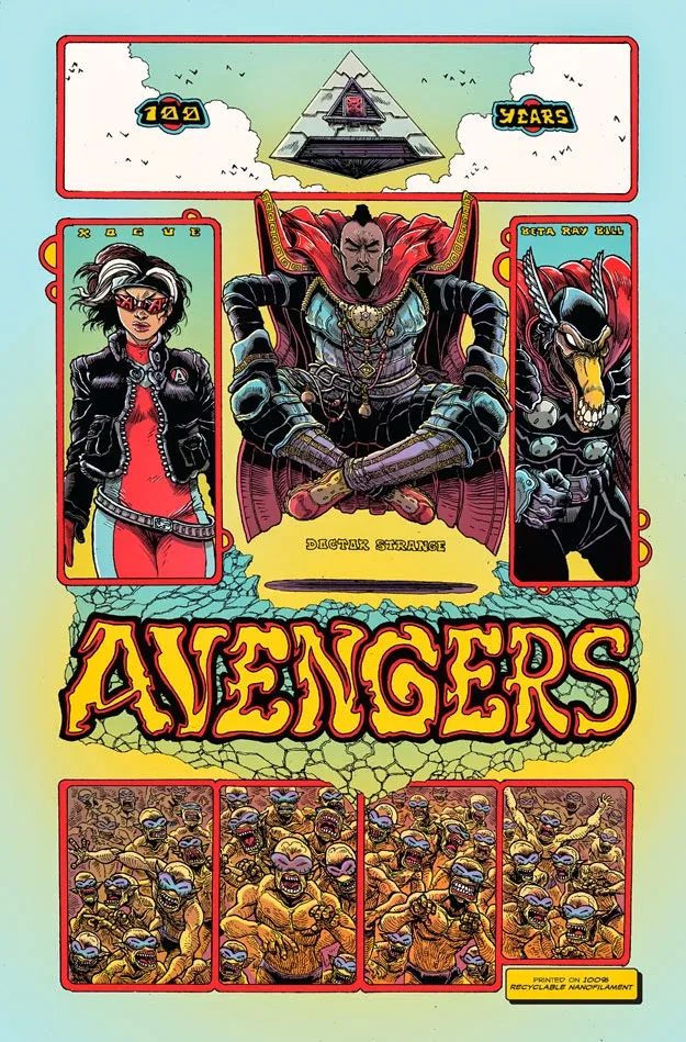 How will the Avengers of 2061 cope? That is where James Stokoe’s Marvel 100th Anniversary Special issue, an Avengers #1, opens.