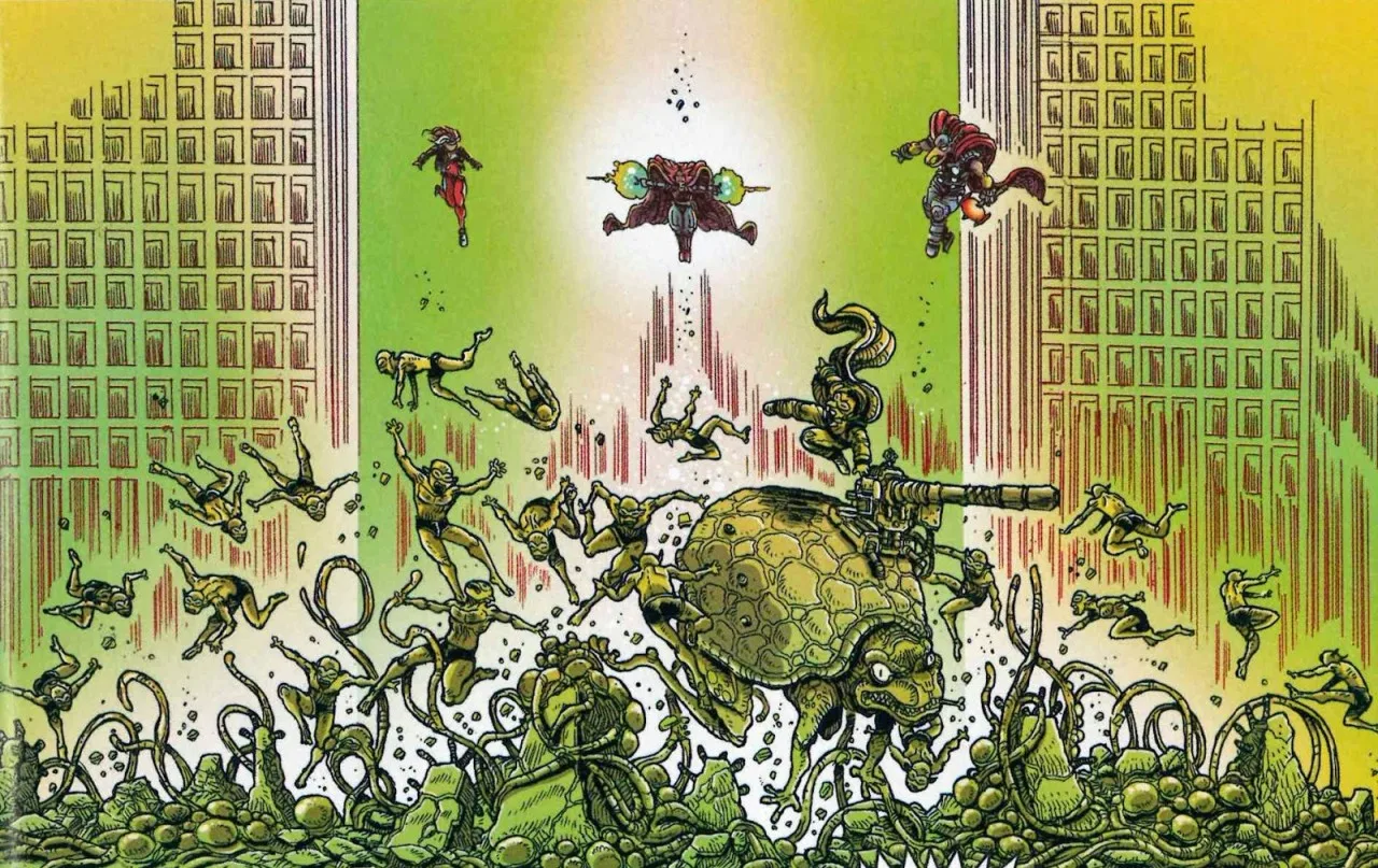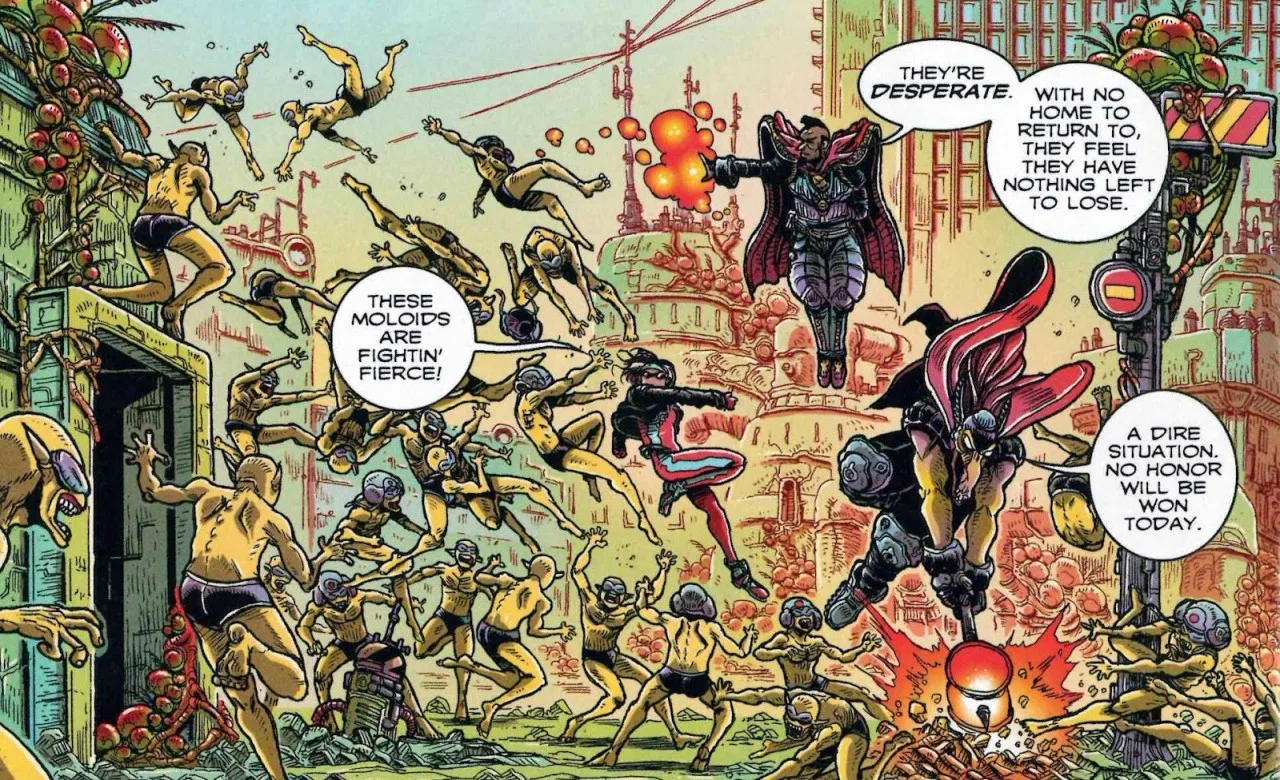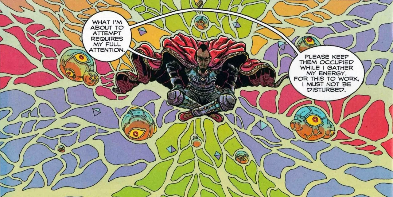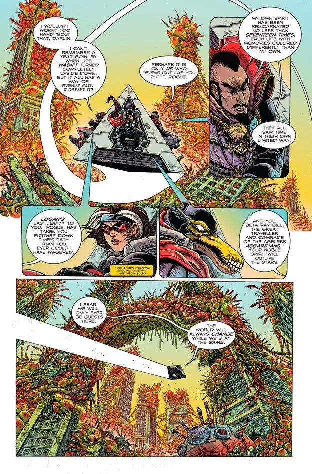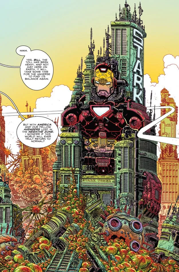 Even in 2063, the Avengers are still dedicated to helping and protecting those that need protecting In this case, that means what remains of Earth after a failed Badoon invasion and America getting sucked into the Negative Zone. And while they do end up fighting the son of a familiar Marvel villain, they manage to not only stop him but also find a habitat for an endangered species. Y’know, just a normal day. In the world of 2063, the Avengers are still the same heroes you know and love – sort of. There’s Rogue and Beta Ray Bill. Doctor Strange, who’s currently inhabiting his 13th body by the time we see him here. And what would an Avengers comic be without Tony Stark? Of course, his body has been destroyed and Stark Tower is a huge Iron Man suit containing a segmented piece of his brain, but that won’t stop him from helping the team. We also see an appearance by Captain America, but I won’t spoil more than that here.