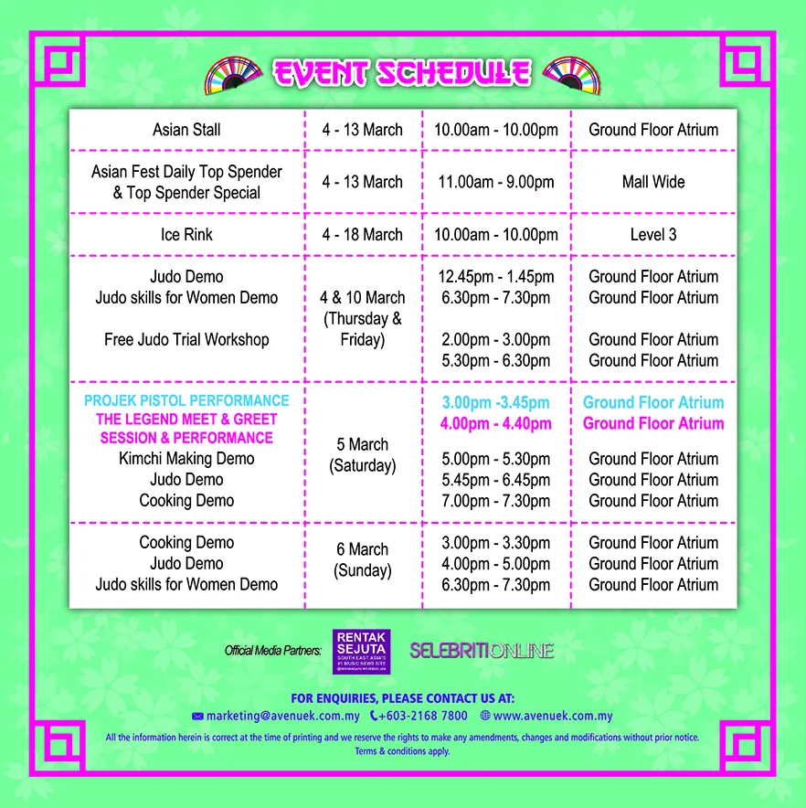 Avenue K will be organising its first Asian Festival from 4th to 13th March 2016 at Ground Floor Atrium, showcasing beauty products, food, desserts, merchandises, culture, and martial arts.