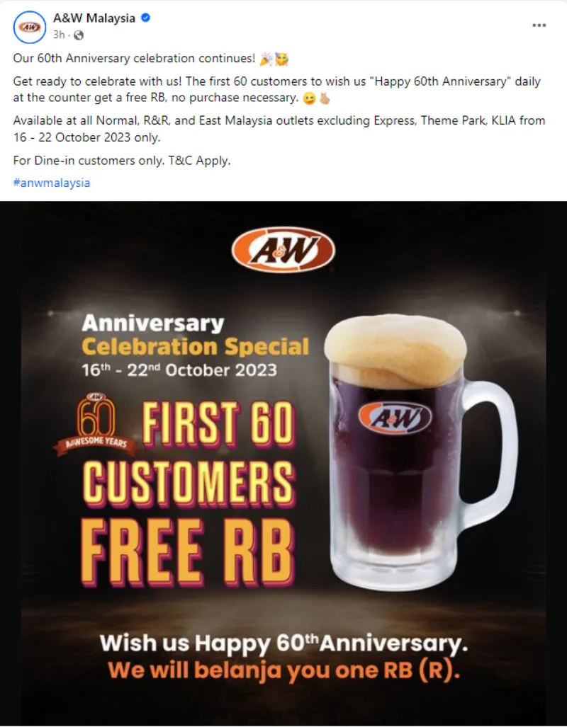 But if you’re not eligible for the free meal promo, don’t worry because A&W has other promotions available – including their free RB (rootbeer) giveaway! From now till 22nd October, A&W will be giving away a free RB, without any purchase necessary, to the first 60 customers for the day to wish them a “Happy 60th Anniversary”. Like the free meal promotion, redemption for the free RB is only available for dine-in customers and only at A&W outlets in West Malaysia, excluding express, theme park and airport outlets.