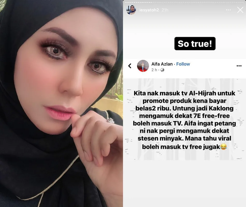 Meanwhile, Iesya (Nor Iesyatirradiah Sanny Toh) recently reposted a screenshot of a Facebook post written by Aifa Azlan.. The fashion entrepreneur remarked, “In order to appear on TV AlHijrah, we have to pay up to tens of thousands of ringgit. Lucky for Kak Long, all she had to do was to go berserk, and later on appearing on television for free.” The “Selamat Pagi Malaysia” host was spotted sharing her response, agreeing with Aifa’s opinion on the case.