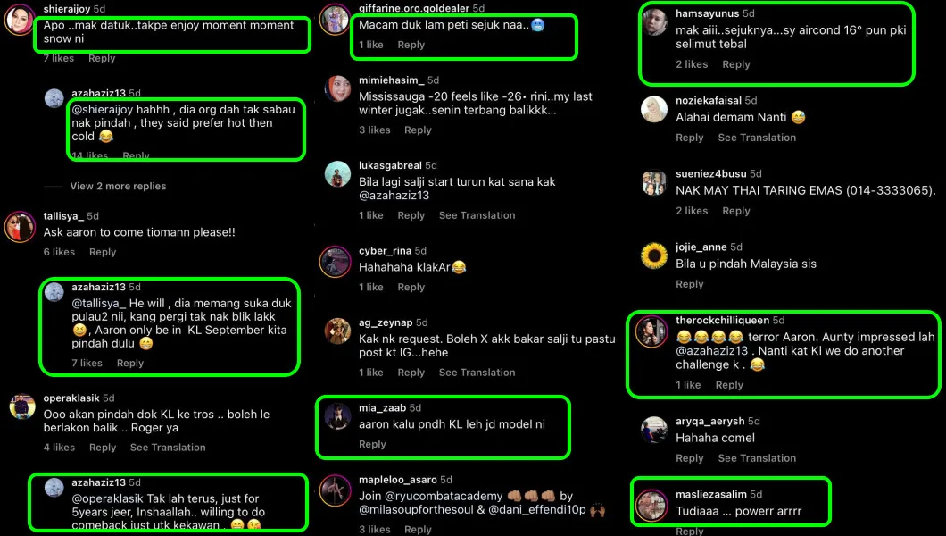Actress-cum-radio announcer Sharifah Shahirah also reacted to the video of the boy posted by the 50-year-old. “Just enjoy the moment,” the female comedian wrote, to which Azah replied by saying that her kids are eager to come back to Malaysai. “They prefer the hot weather over the cold weather here,” she revealed.