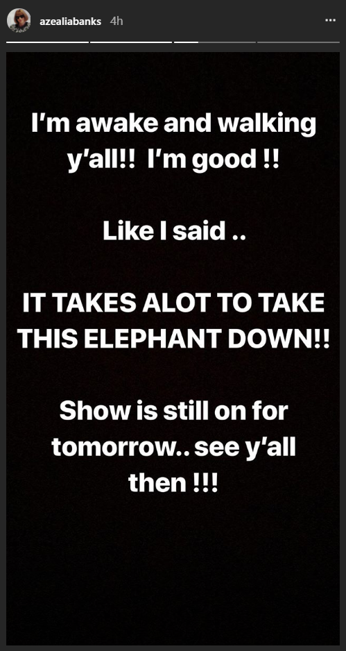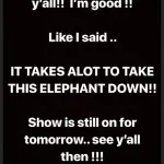 In a previous Instastory, she wrote, “I’m awake and walking y’all!! I’m good!! Like I said.. IT TAKES A LOT TO TAKE THIS ELEPHANT DOWN!! Show is still on for tomorrow.. See y’all then!!!”