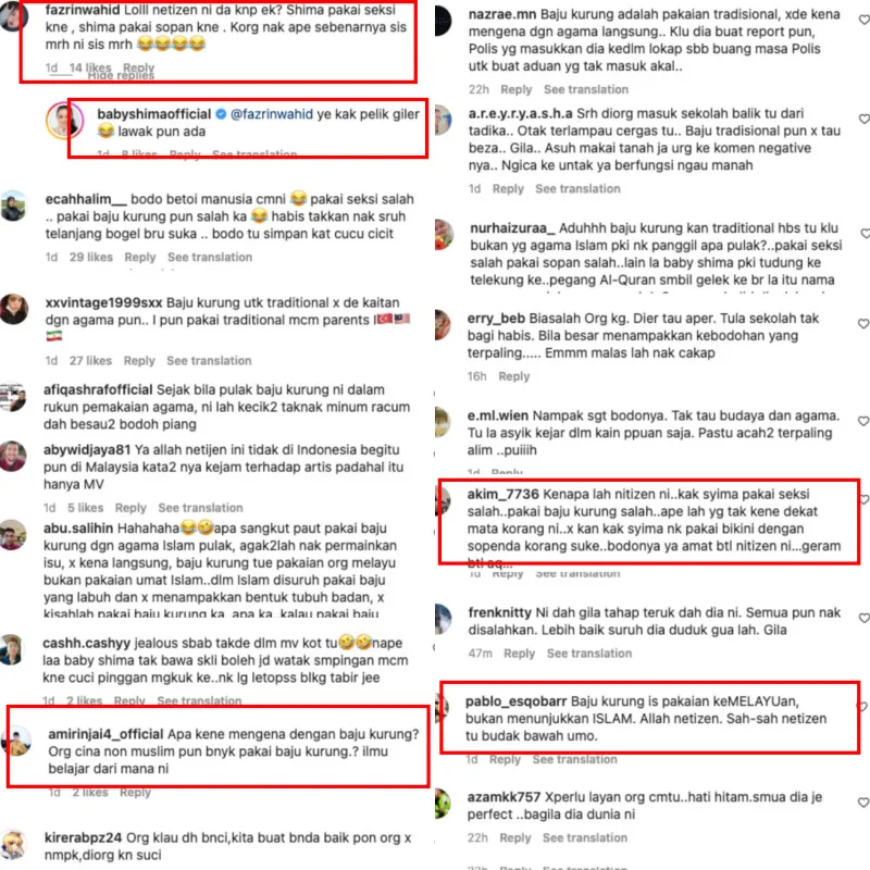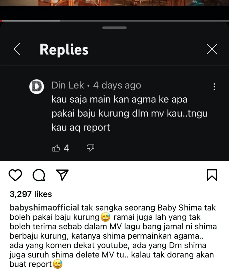 Baby Shima called one netizen out, saying, “Apparently, I’m not allowed to wear baju kurung 😅 people couldn’t accept the fact that I dressed modestly in the MV, accusing me of ‘using religion for personal gain’. Some even DM-ed me to delete the video or else they’ll report it 😅”. Fans showed support for the singer with some commenting that the traditional outfit has nothing to do with religion.