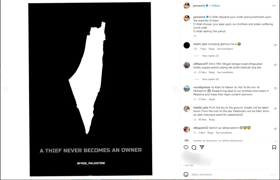 Earlier this week, Baby Shima posted a (now-removed) photo of the Israeli flag with the words, “Praying For Israel. May Allah remove them from this earth. Ameen” written at the bottom. While most of her fans found humour in the post, Janna Nick thought it was insensitive. “Stop making this kind of content. This is not a joke. Thank you,” she said in a now-deleted comment.