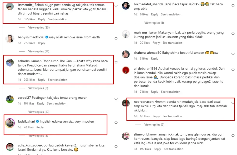 The original post was also soon taken down by Instagram. As seen above, the following day, producer Fadzil Zahari commented on a netizen’s post of the same photo. Baby Shima then warned the producer for commenting on the post as she feared Janna would criticise him for it as well. The “Sejenak Sendiri” songstress addressed the situation in her IG stories.