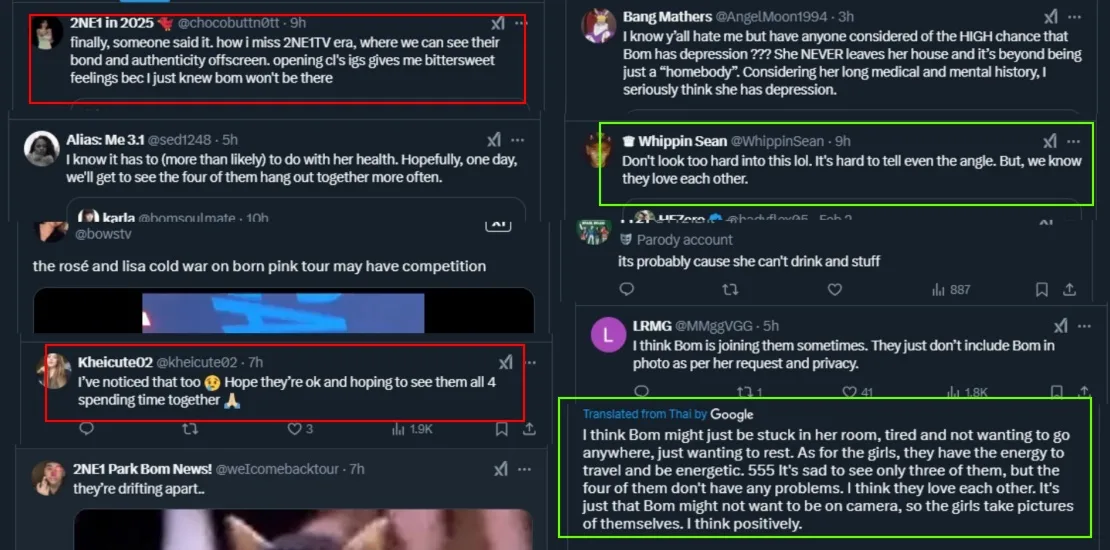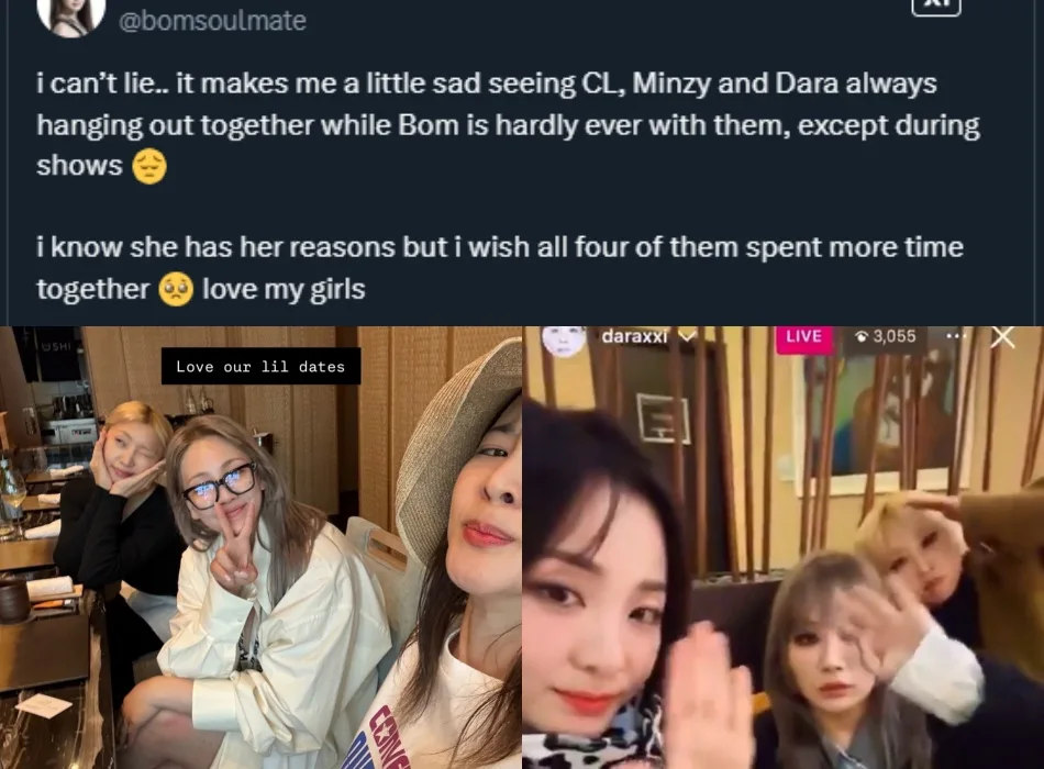 One netizen posted a recent group photo of 2NE1 without Park Bom, highlighting that she was also absent during an Instagram Live session. The fan expressed disappointment at seeing that the members no longer appeared to spend as much time together as they once did. A TikTok user also posted a video that seemingly highlighted the contrast between how the girls behaved at the start of the tour and how they are now, specifically leader CL and Park Bom.