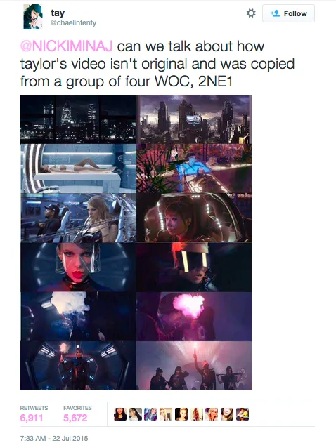 It all started with this tweet by one Blackjack (aka 2NE1 fan) who was convinced that “Bad Blood” ripped off K-Pop idol girl group 2NE1’s music video for “Come Back Home”: