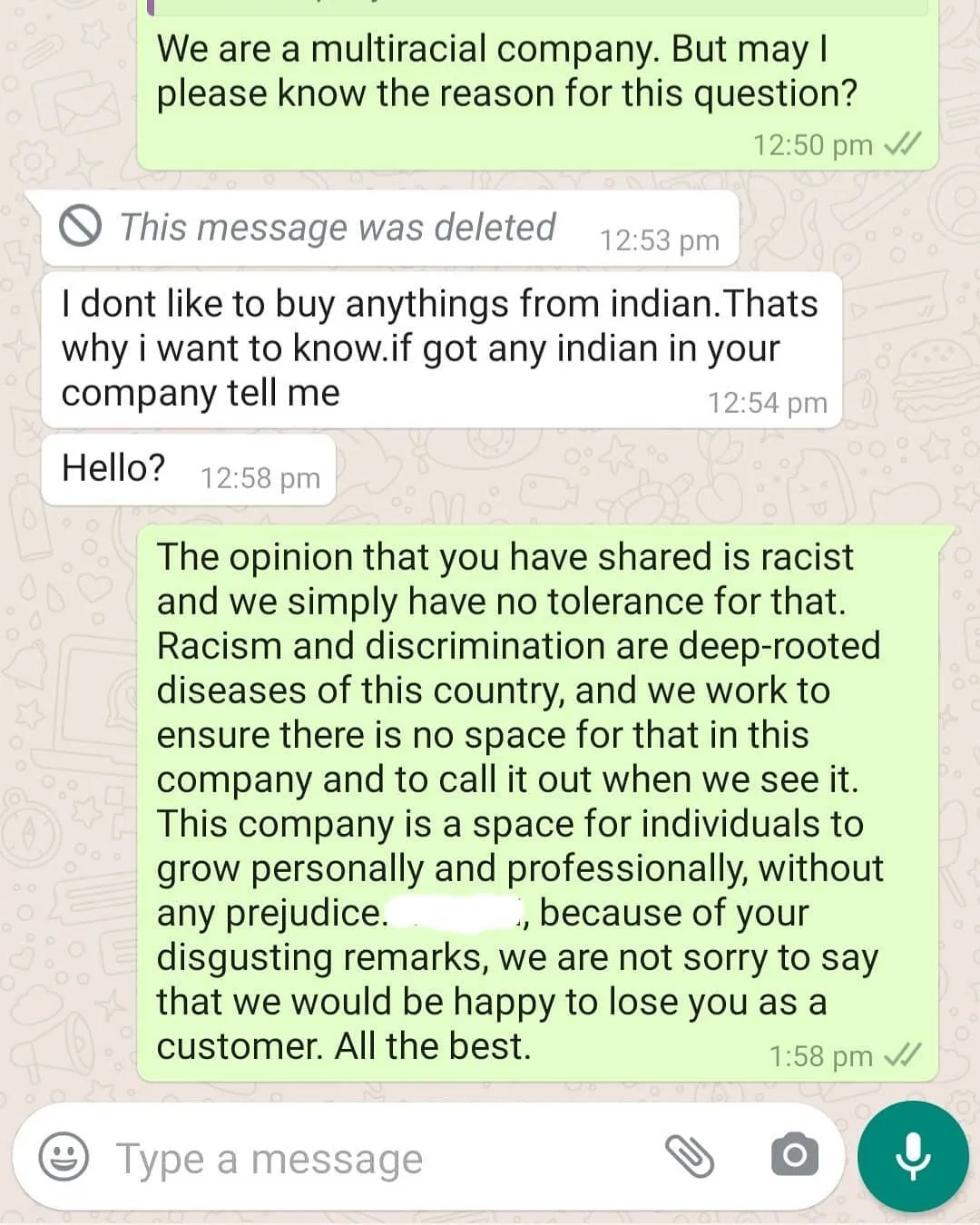 “Racism and discrimination are deep-rooted diseases of this country, and we work to ensure there is no space for that in this company and to call it out when we see it. This company is a space for individuals to grow personally and professionally, without any prejudice. Because of your disgusting remarks, we are not sorry to say that we would be happy to lose you as a customer. All the best,” Thirty One Fine Bakes replied.