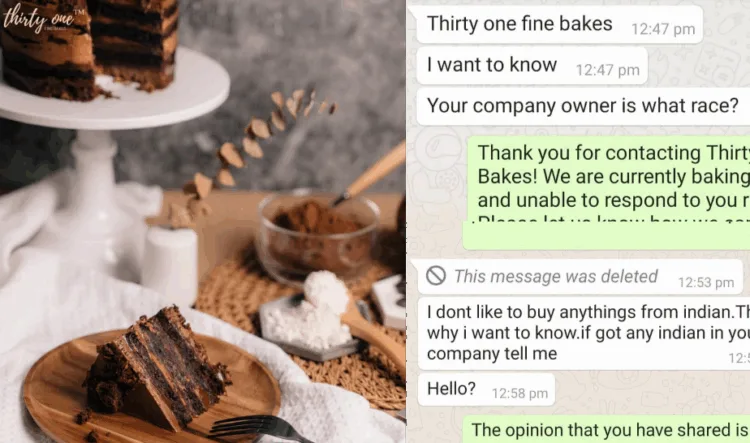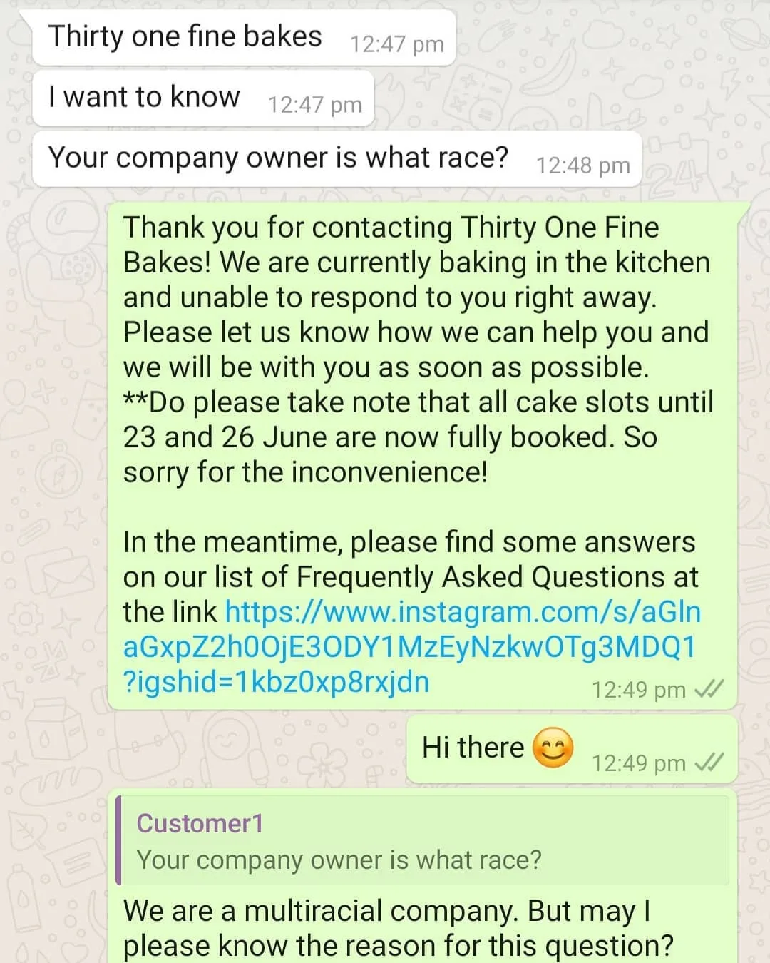 In the Whatsapp message exchange, a customer had the audacity to question the ethnicity of those working at Thirty One Fine Bakes, particularly the owner.