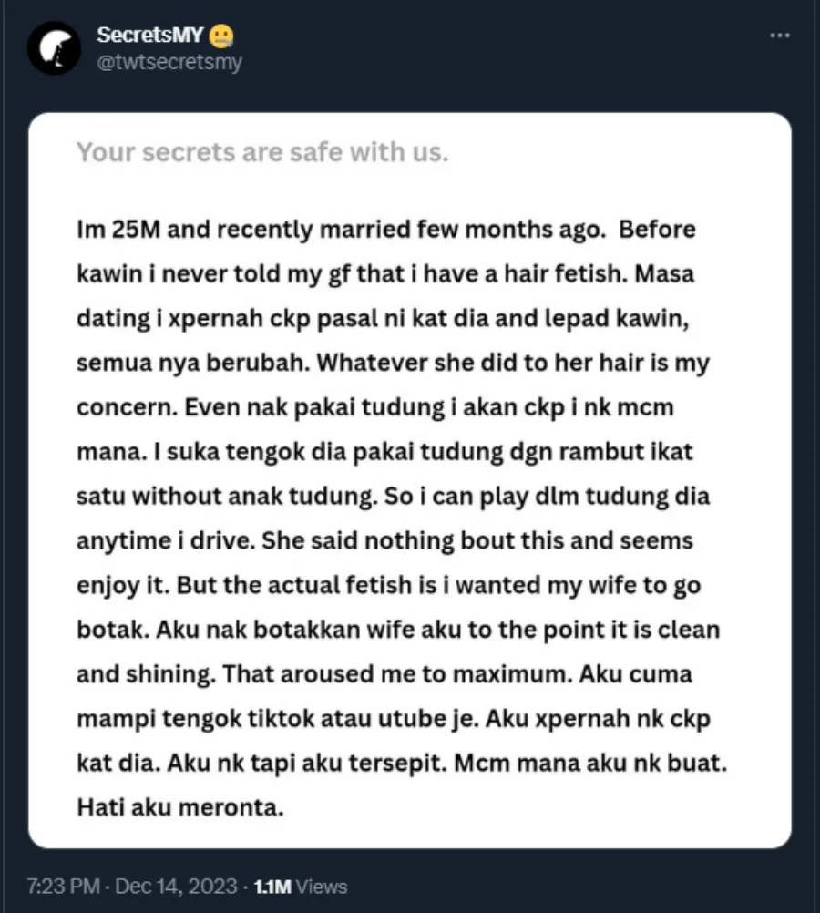 Through a submission on SecretsMY’s Twitter page, a 25-year-old man revealed that he has an unusual fixation with his wife’s hair. He said that it’s gotten to a point where he would be concerned about how she wears her hijab. “I like it when she ties her hair a certain way underneath her hijab so I can play with it whenever we’re driving together. She seems to enjoy it ’cause she never complained,” he wrote.