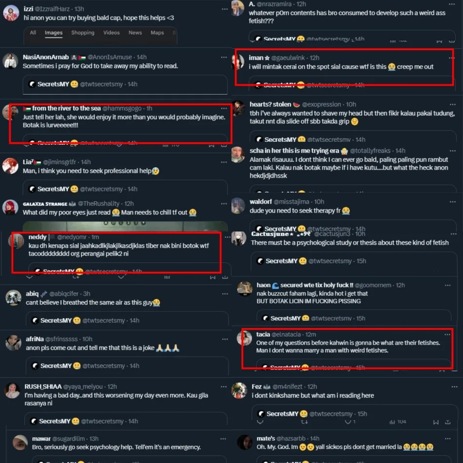 Though a harmless fetish, it is still a rather odd one but we’re not here to judge anyone. Netizens, however, were concerned and disturbed after reading another confession from an anonymous Twitter user who wanted to shave his wife’s head. Here’s the story: