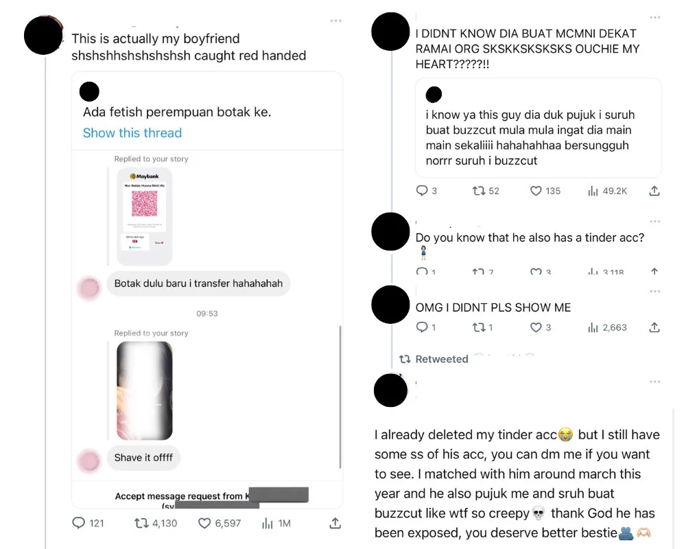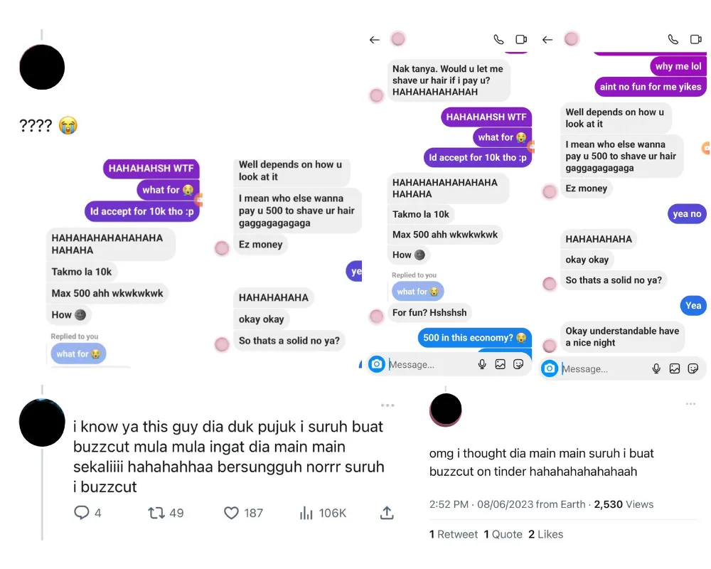 Under the original tweet, Twitter user ‘B’ shared her conversation with him on Facebook Messenger. In the screenshot, he asked ‘B’ if she would shave her hair if he paid her RM500. The chat between the two ended with her declining the offer.