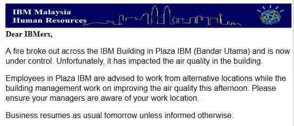 IBM Malaysia Sdn Bhd has also sent out a memo to all of its employees to urge them to work from alternative locations, citing the “air quality in the building” due to the fire. “Employees in Plaza IBM are advised to work from alternative locations while the building management work on improving the air quality this afternoon. Please ensure your managers are aware of your work location,” the memo said.