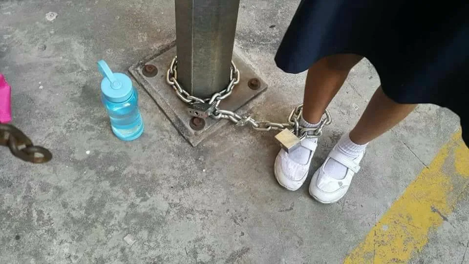 Social media is abuzz with photos of a primary schoolgirl chained to a lamp post. The photos were allegedly taken at the parking lot of Sunway Perdana Condominium in Bandar Sunway.