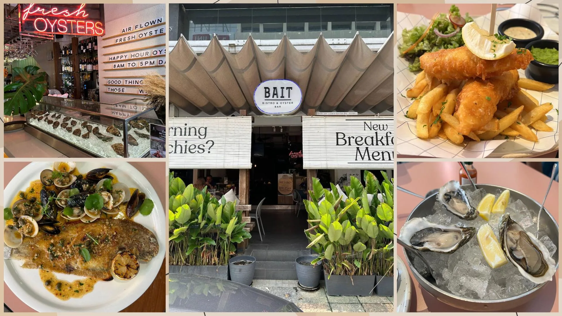 Situated in the well-travelled Telawi 3 area of Bangsar, BAIT is KL’s original seafood and oyster bar, tucked away amid the many restaurants of the gourmet hotspot. The restaurant’s pink neon sign, which blinks a tempting announcement of fresh oysters, instantly draws attention to its straightforward, unadorned décor of wooden paneling and naked lightbulbs strung from latticed metal frames.