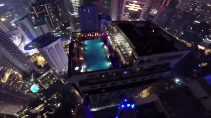 The website reports that the jumpers were in town for the KL Tower International Base Jump event, and the pool party was part of the festivities. But not everyone at the party knew that a few of the guests would be jumping into the pool from another building.